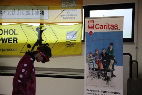 Doch damit nicht genug, denn im Oktogonbereich standen für die Mädchen und Gäste weitere Attraktionen bereit. So wurde unter dem Motto „Kinder stark machen – Suchtprävention“ durch den Caritasverband Euskirchen ein Parcours angeboten, den man mit einer Rauschbrille durchlaufen sollte. Damit wurde simuliert, wie sich Alkoholgenuss auf den Körper auswirkt und man munkelt, dass selbst gestandene Männer so ihre Probleme hatten diese zehn Meter voller Hindernisse zu durchlaufen. Des Weiteren beteiligten sich die Gesundheitskasse IKK classic und der Studienkreis für Nachhilfe Mechernich mit einem Informationsstand an dem Aktionstag. Alle Angebote wurden durch die Mädchen angenommen und das Ziel der Aufklärungsarbeit erreicht.