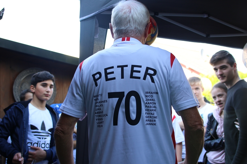 In der Folge saßen Geburtstagskind, Familie sowie Mannschaft ein paar gemütliche Stunden bei Speis und Trank zusammen und ließen Peter abermals hochleben. Die Kinder spielten, was auch sonst, Fußball und dem Ehrengast wurden zwischendurch immer wieder persönliche Momente gewidmet. Erst war es ein Essenskorb mit Herzhaftem und Süßem, dann folgte die Einkleidung mit einem neuen FC-Trikot. Danach gab es eine kleine Lesestunde und die Überreichung eines etwa 180 Seiten dicken Fotobuches samt der Steckbriefe und zu guter Letzt wurden Opa Peter noch ein, zwei oder auch drei Liedchen gesungen.