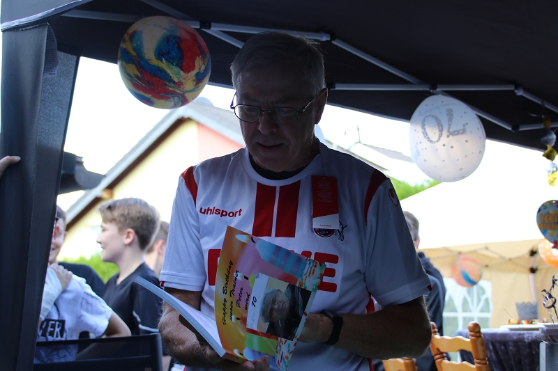 Damit aber nicht genug, denn so einfach wollte man Peter nicht davon kommen lassen, denn schon tagsdrauf ging es weiter. Während der 70-Jährige von seiner Frau vom Familiennest wegelotst wurde, trieben ein paar Heinzelmännchen ihr Unwesen auf Peters Grundstück. Es wurde innerhalb weniger Stunden aus dem beschaulichen Gartenidyll eine kleine Partylocation mit Pavillions, Grill und schöner Deko gezaubert, sodass das Überfallkommando einrücken konnte. Wenngleich die ganz große Überraschung, Trainer und Kinder hatten sich in der Garage versteckt, aufgrund einer dringenden Toilettenaufsuche, misslang, so war die Freude bei Peter kurze Zeit später trotzdem groß.