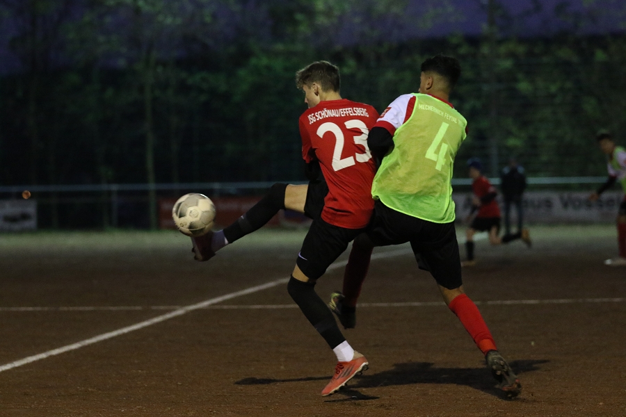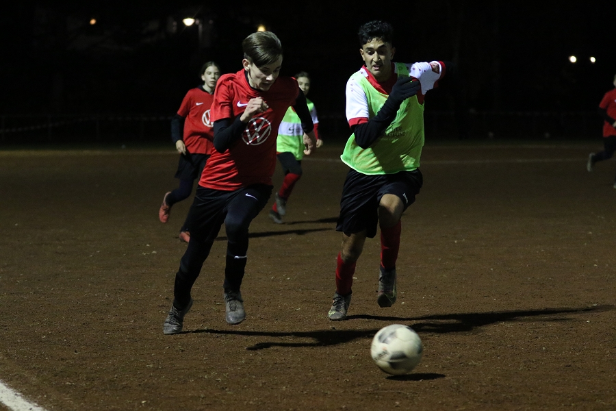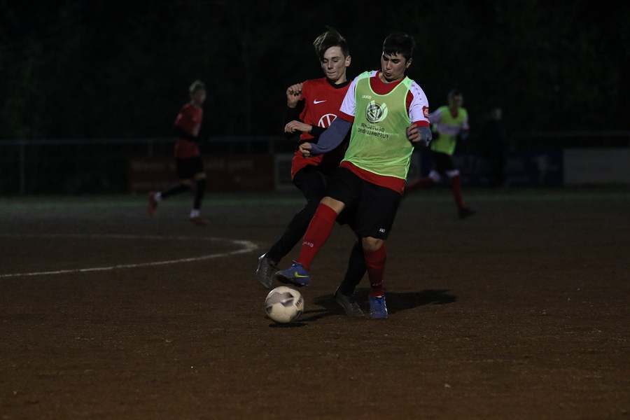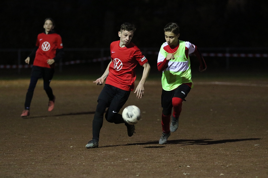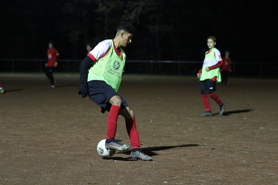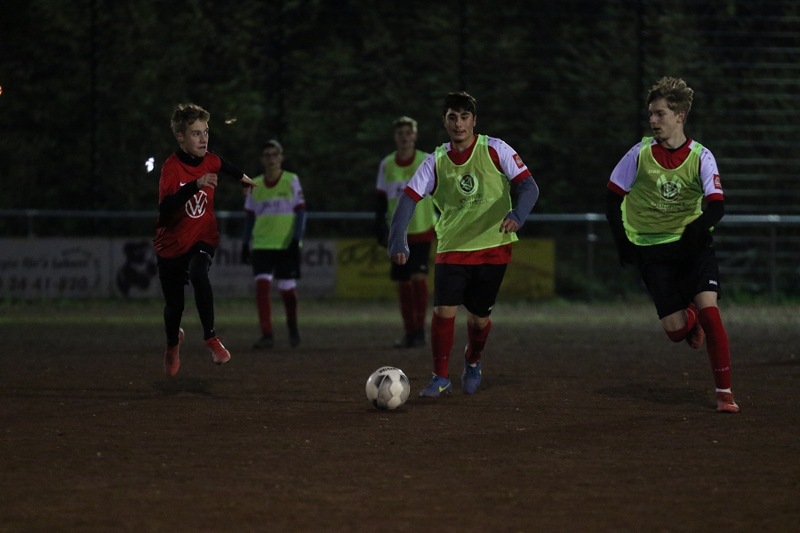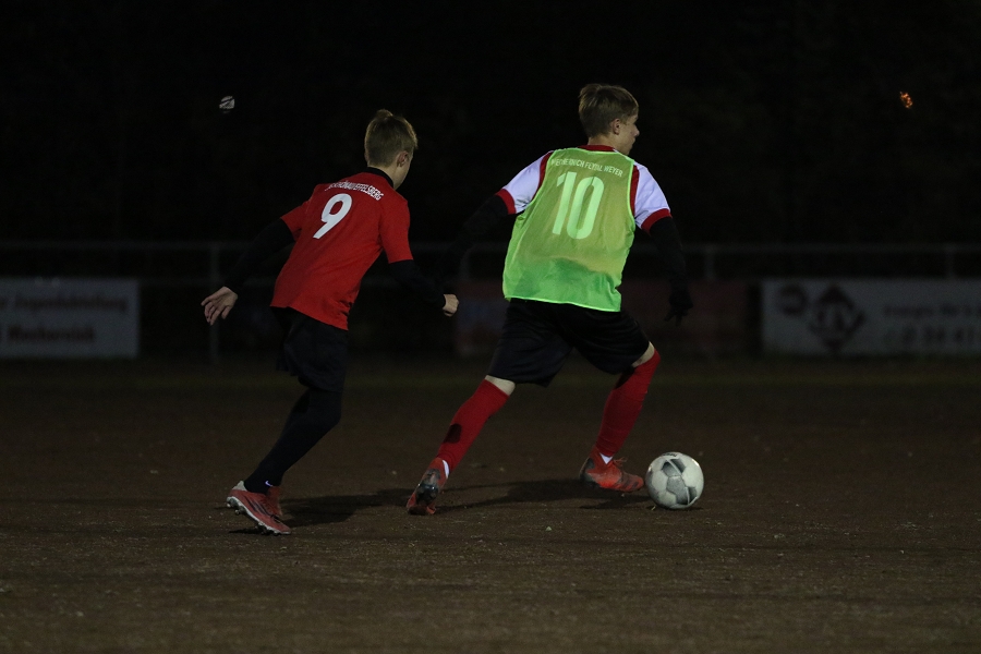 Aus dem Hinspiel von vor zwei Wochen war klar, dass der Gegner durchaus ein Gegner auf Augenhöhe ist, der sich entsprechend nicht hinten verschanzt, sondern auch den Vorwärtsgang kennt. Und genau so war es auch an diesem Freitagabend auf dem großen Spielfeld im Eifelstadion. Während bei uns viele Jungs des 2007er Jahrgangs auflaufen, hat der Gast sogar Spieler des 2009er Jahrgangs in seinen Reihen. Die "Kleinen" kämpfen aber bis zum Umfallen und schrecken selbst vor körperlich überlegene Spieler nicht zurück.