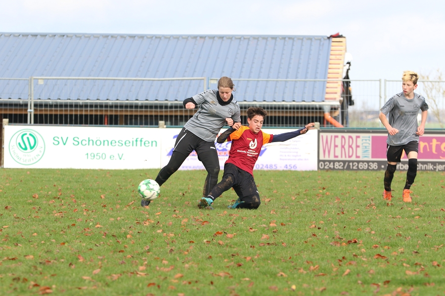 Unsere C2-Junioren haben ihr letztes Auswärtsspiel bei der JSG Herhahn-Morsbach/Schöneseiffen/Dreiborn mit 0:10 (0:4) verloren, sich aber gegenüber der 0:18 Hinspielniederlage deutlich verbessert präsentiert. Auf dem tiefen Boden in Schöneseiffen stand für Trainer Torsten Schmidt kurzfristig nur ein 13er-Kader zur Verfügung. Philipp kehrte nach überstandener Krankheit in das Tor zurück und erwies sich, trotz der Gegentore, als zuverlässiger Rückhalt, der eine höhere Niederlage verhinderte.