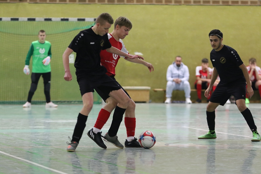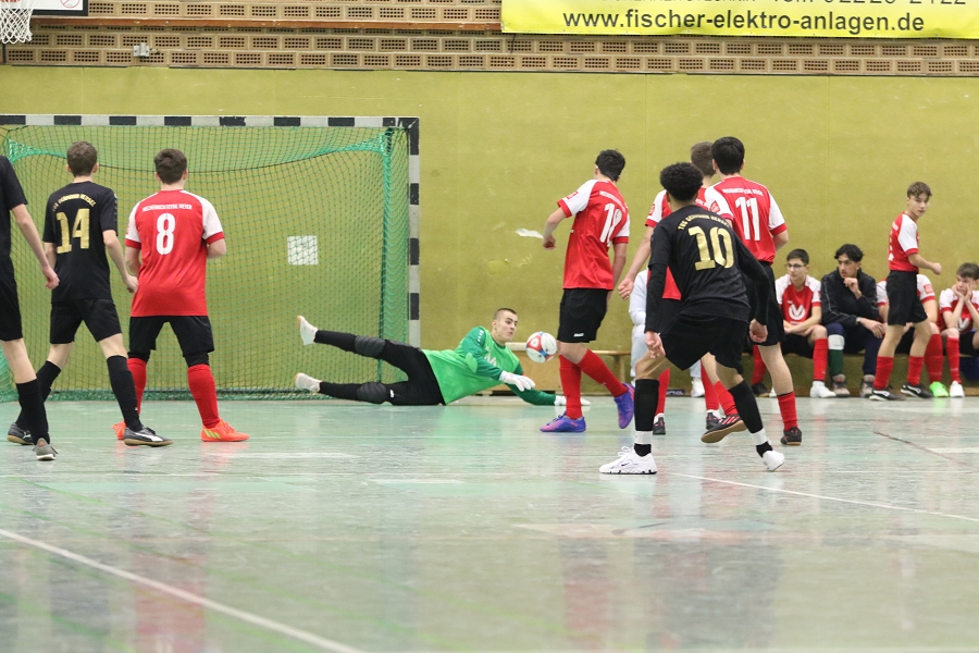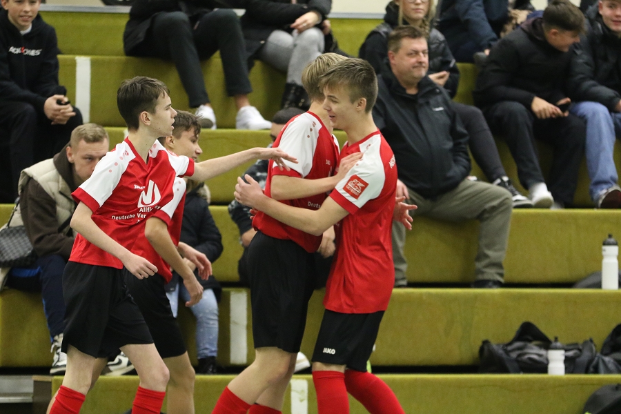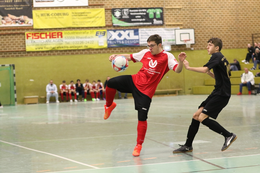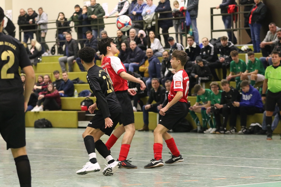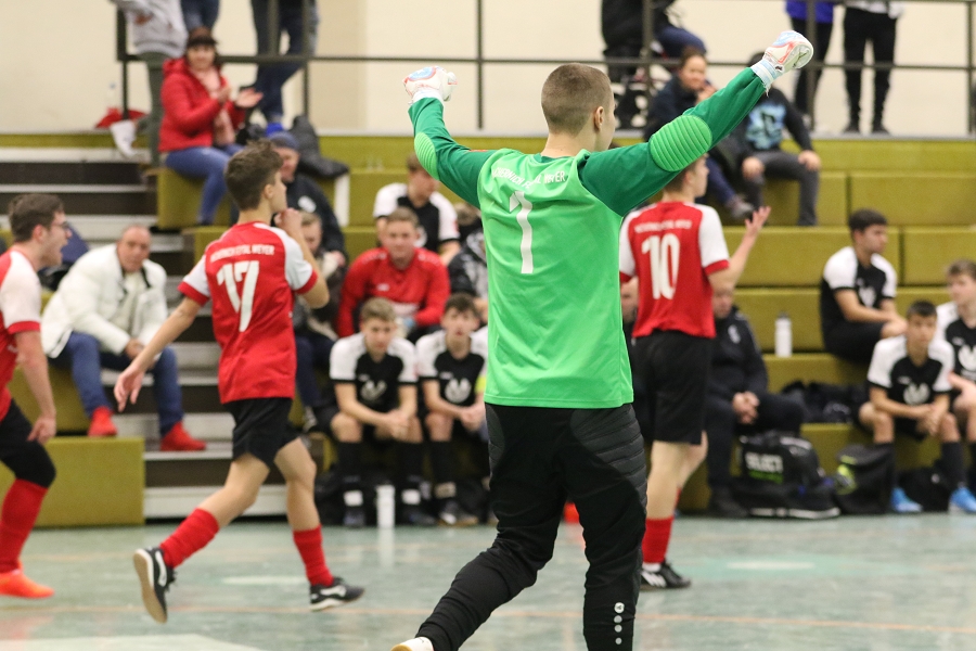 Hier traf man erneut auf Gruppengegner Merzbach, der nicht nur im Halbfinale die Halle hinter sich hatte und den Turnierfavoriten Bonn-Roleber ausschaltete, sondern auch jetzt mit Schwung die Revanche zur Niederlage eine Stunde zuvor suchte. Merzbach begann besser, doch auch wir hatten Zug zum Tor parat. Nach einer Ecke von Nils, die scharf in die Mitte kam, war es ein Abwehrspieler, der den Ball ins eigene Netz beförderte. War es das schon? Ja, vom Ergebnis her ja, denn wie eingangs erwähnt reichte eine 1:0 Führung immer für den Sieg. Dennoch musste mit viel Kraft und Abwehrarbeit bis zum Schluss gekämpft werden, da Merzbach zu keiner Zeit aufsteckte.