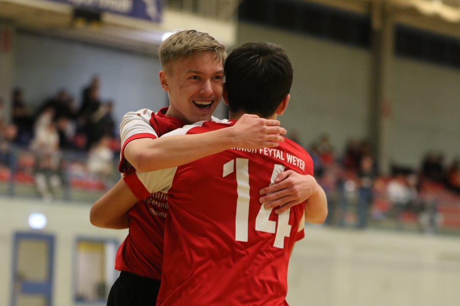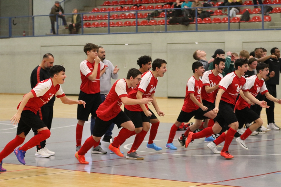 Somit blieb "nur" das kleine Finale, welches wir gegen den SV Germania Impekoven auszutragen hatten. Er entwickelte sich von Anfang an ein gutes Spiel mit vielen Torabschlüssen und zwei glänzend aufgelegten Torhütern auf jeder Seite. So war es nicht verwunderlich, dass die beiden Schlussleute sich mit ihren Paraden übertrumpften und die gegnerischen Stürmer das Nachsehen hatten. Dieses Spiel, welches hin- und herwog, hätte entweder ein knappes 5:4 in irgendeine Richtung oder aber, so wie es letztlich kam, ein Finale-Grande vom Achtmeterpunkt verdient. Hier traten jeweils drei Schützen an und ließen den Torhütern zunächst keine Chance. Wir mussten zwar immer nachziehen, hatten aber mit Henrik, Luka und Ibrahim drei treffsichere Jungs in unseren Reihen. Dann ging es im KO-Modus weiter und Moritz parierte sofort den ersten Strafstoß eines Germania-Spielers. Niklas übernahm, nachdem er im Gruppenspiel gegen Stotzheim/Wisskirchen noch verschoss, die Verantwortung und setzte die Kugel sicher zwischen die Pfosten. Das wars und die Jungs ließen ihren Emotionen freien Lauf und gratulierten sich gegenseitig zum 4:3 n.E. Erfolg.