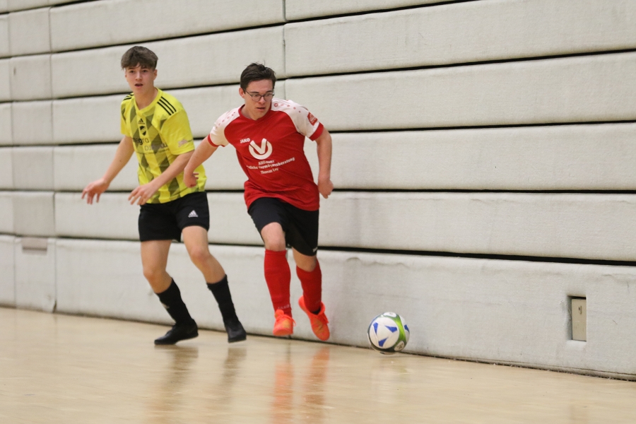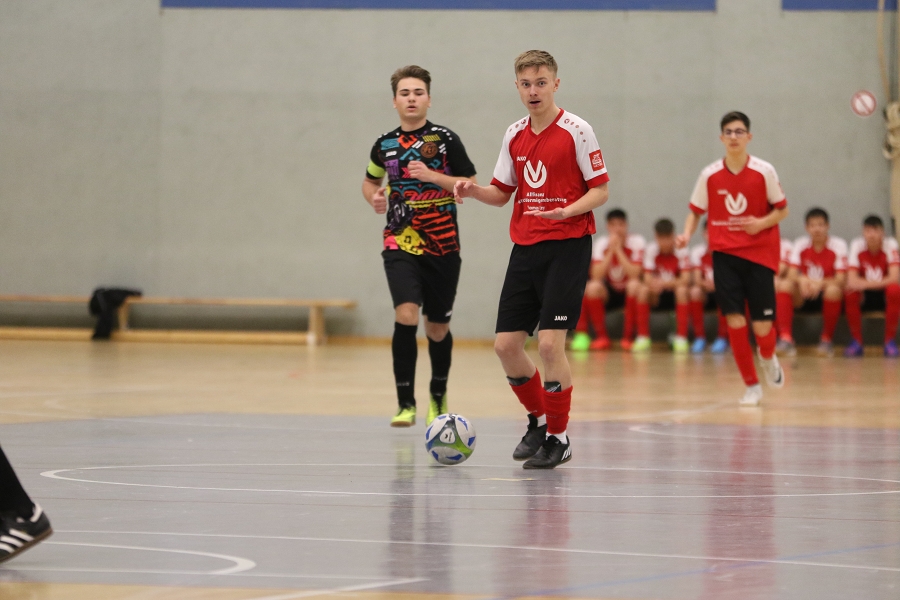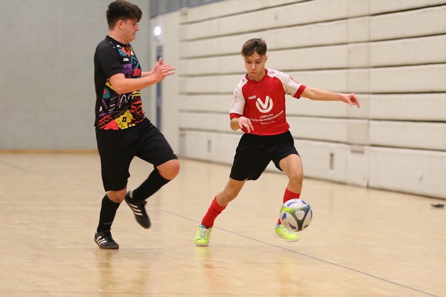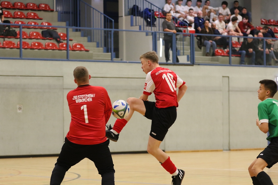 Es folgte der Vergleich mit Stotzheim/Wisskirchen, die wir auch beim Merzbacher Turnier schon in unserer Gruppe hatten. Diese Partie war deutlich umkämpfter und es ging körperlich das erste erste Mal richtig intensiv zur Sache. Beide Mannschaften schenkten sich nichts und so war es wahrlich ein Duell auf Augenhöhe mit Höhepunkten auf beiden Seiten. Den kleinen aber feinen Unterschied machte in der Offensive dann unser Luka aus, der sich aus knapp 20 Metern Torentfernung ein Herz fasste und die Kugel in den linken oberen Winkel an den Innenpfosten nagelte. Von da aus ging, zum Glück muss man sagen, der Ball ins gegnerische Tor. Ein wahrlicher Sonnatgsschuss morgens um 0:04 Uhr, welches seinen verdienten Applaus vom Großteil der Anwesenden erntete. Danach wurde es hitziger und auch unser Keeper Moritz geriet mehr und mehr in den Fokus. Seine Paraden hielten uns aber letztlich im Spiel. Dann bekam Felix eine Zeitstrafe und wir agierten zwei Minuten in Unterzahl. Die Chance zur Entscheidung nach einem Foul an Gerome hatte dann Niklas, der zum Strafstoß aus acht Metern antrat. Er scheiterte aber mit dem am gegnerischen Keeper (9.). Kurz Zeit später lag Gerome erneut am Boden und musste mit großen Schmerzen vom Feld getragen werden. Ein sofortiges Aufsuchen des Krankenhauses brachte die traurige Gewissheit, dass er aufgrund seiner schweren Verletzung (Beinbruch) monatelag ausfallen wird. Trotz aller Rückschläge brachten unsere Jungs das knappe 1:0 über die Linie und so war ihnen Platz zwei in der Gruppe sicher.