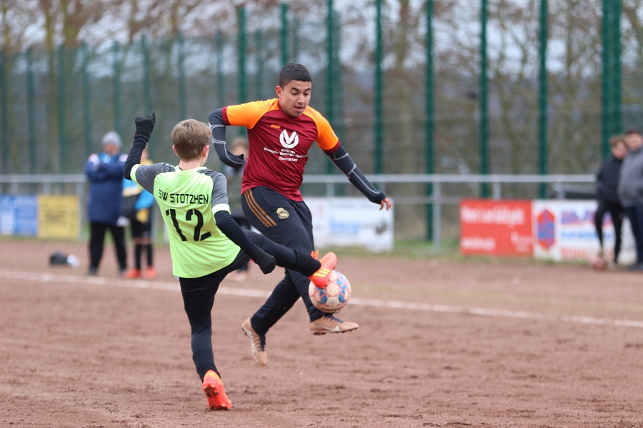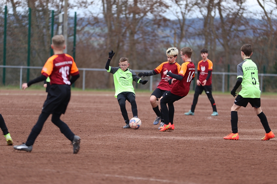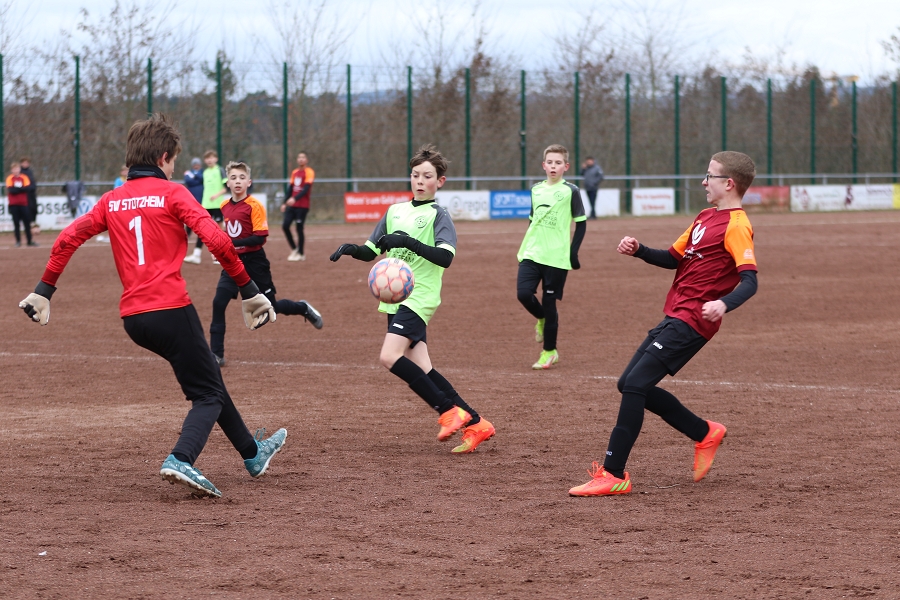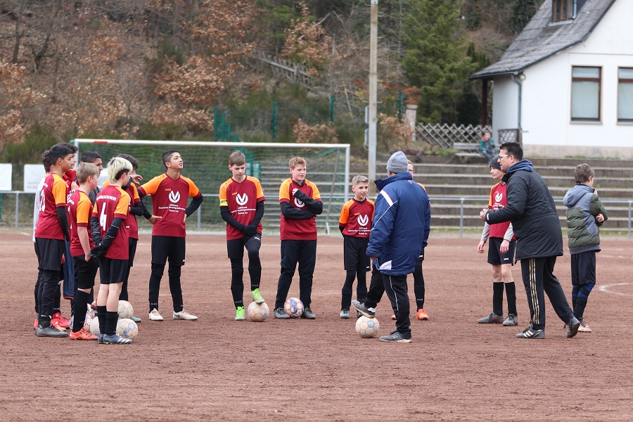 Die Partie gegen Stotzheim musste wegen der Platzsperre in Weyer nach Mechernich gelegt werden. Zwar ist das Eifelstadion der angestammte Trainingsplatz, aber wer die Mannschaft kennt, der weiß, dass die Größe und die Beschaffenheit des Bodens nicht wirklich als Vorteil für die Jungs anzusehen ist. Und so war es dann auch eine Partie, die von beiden Mannschaften mit wenig Tempo und ohne wirkliche Spielideen abgespult wurde. Selten gab es Stationen über mehr als drei Anspiele, vielmehr waren es Einzelaktionen die nach der Partie, welche im Übrigen mit 1:4 (0:3) verloren ging, hängen bleibt. Unser Auftreten war nicht gut, denn so richtig das Zepter in die Hand nehmen wollte keiner der Jungs. Neuzugang Felix H. war auf der rechten Außenbahn noch der auffälligste Spieler, dem Luca Ba. zumindest in Hälfte zwei in nichts nachstand. Leider waren ihre Ausflüge selten von torgefahr gekrönt. Auf Philipp im Tor, war mit kleiner Ausnahme beim ersten Treffer Stotzheims, wo er den Ball nur seitlich abklatschen lassen konnte, ein gewohnt sicherer Rückhalt. Das Stotzheim nach dem 1:0 Führungstreffer zu weiteren einfachen Toren kam, war an haarstäubenden Fehlern unserseits festzumachen. Ziemlich planlos waren es zwei gespielte die Bälle, die Stotzheims Linksaußen an der Mittellinie aufnahm und mit Zug zum Tor im selbigen unterbrachte. Die Messe war beim 0:3 zur Pause bereits gelesen. Die Jungs wurden in der Pause auf dem Feld lautstark von Torsten auf ihre Spielweise und die Fehlerhäufigkeit hingewiesen. Ob es dadurch in Hälfte zwei besser wurde? Bedingt um es wohlwollend auszudrücken, denn mehr als Schadensbegrenzung sprang nicht heraus. Es gab zwar ein paar gute Angriffe, aber richtig gefährlich wurde es eigentlich nur zweimal. Simon vergab erst aus Kurzdistanz, bevor Ben noch per Slapsticktor mit dem Kopf zum 1:4 traf. Da auch Stotzheim kaum noch Aktionen nach vorne hatte, war es eine recht langweilige Partie mit dem besseren Ende für die Gäste.