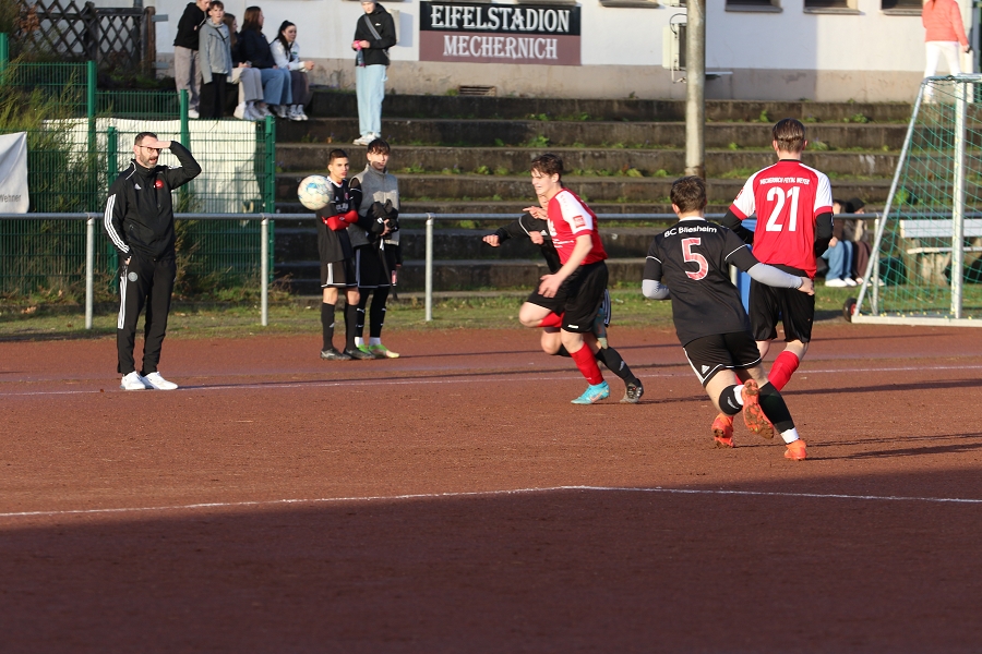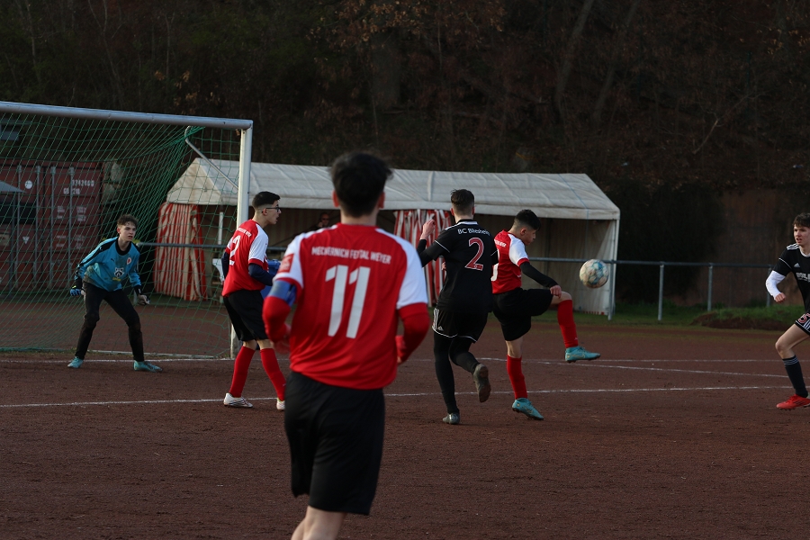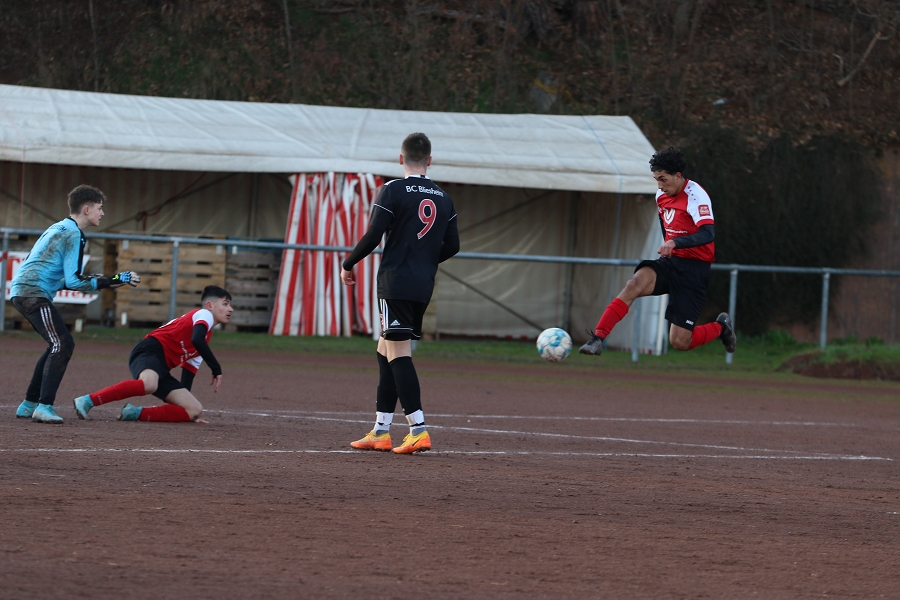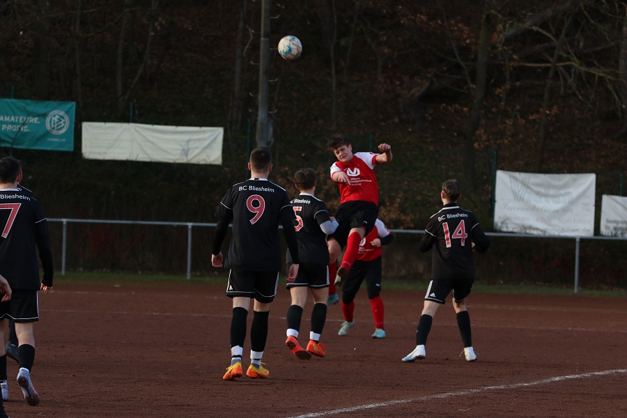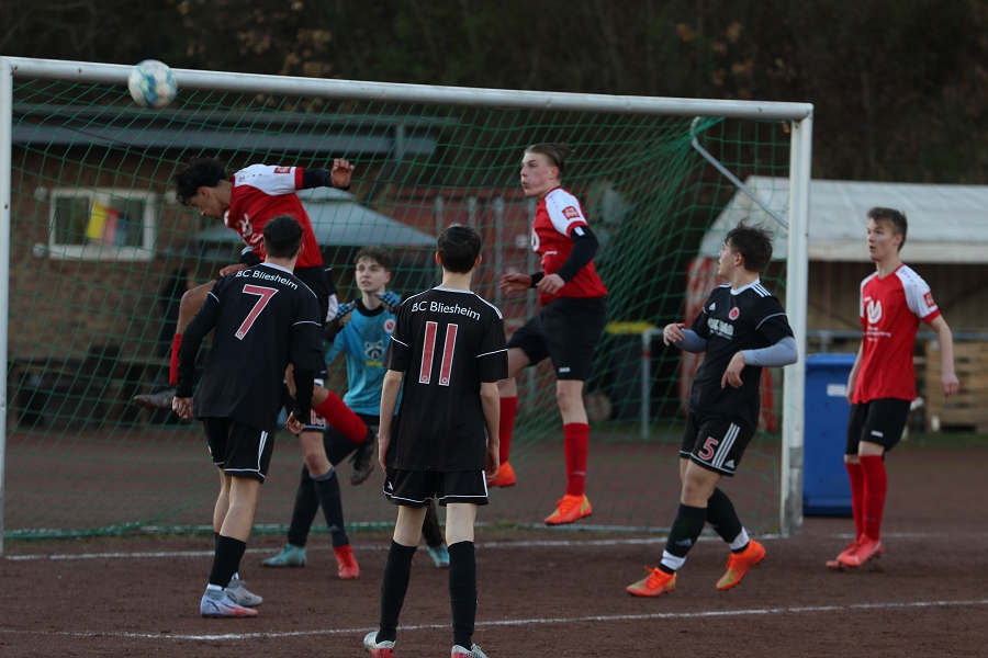 Wie die Feuerwehr legten unsere Jungs von Beginn an los und erspielten sich nicht nur ein paar Abschlüsse, sondern verwertete diese sogar konsequent. Erst durfte Josef nach einer Kopfballvorlage von Bogdan einnetzten (4.), dann brachte Felix einen weiten Einwurf in den Strafraum hinein. Der Ball sprang einmal auch und Ibrahim nahm gefühlvoll Maß um den gegnerischen Torhüter mit einer Bogenlampe zu überwinden (5.). Es lief sogar noch besser, denn Luka zog aus zwölf Metern halbrechter Position trocken aufs lange Eck ab und stellte die Weichen nach neun Minuten auf Sieg. Kurze Zeit darauf, Bliesheim holte bis hierhin nur einen Eckball heraus, war es dann ein Handelfmeter, der die Chance zum 4:0 mit sich brachte. Lenn schnappte sich die Kugel, doch sein Schuss war letztlich zu harmlos und der BCB-Torwart konnte sich halten (10.).