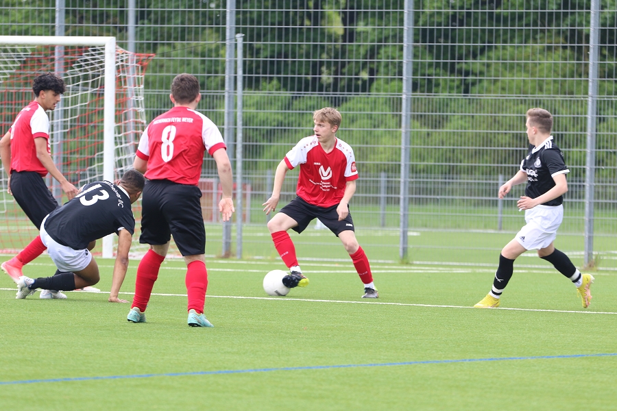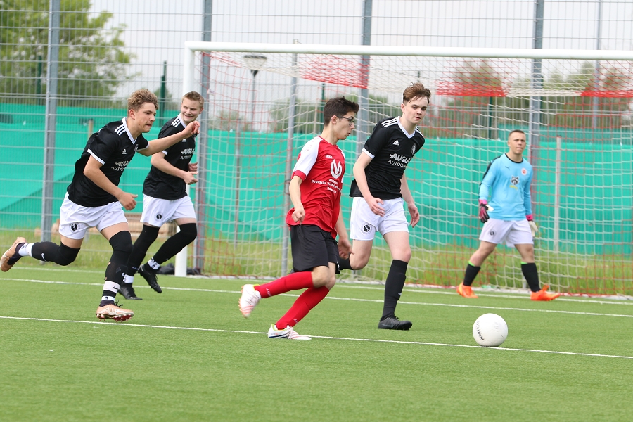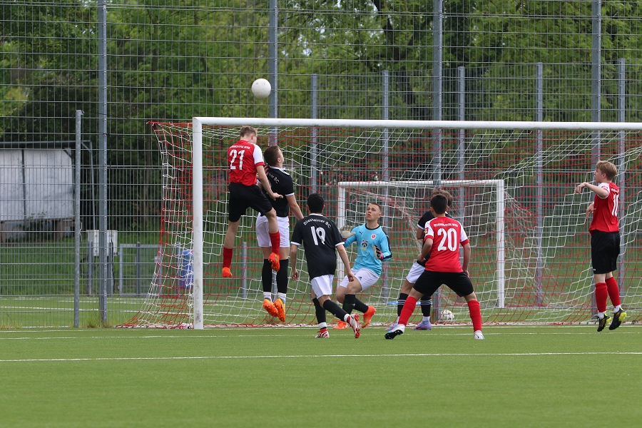 Das die Jungs nach dem Seitenwechsel in die Partie zurück wollten, sah man ihnen an. Verheißungsvoll ging es auch los. Ibrahim per Freistoß und Lenn per Kopfball verfehlten binnen einer Minute nur knapp das Tor. Mitten in die Drangphase hinein, dann der nächste Nackenschlag per Sonntagsschuss in den Winkel. Bliesheim erhöhte per Traumtor zum 3:1 (45.). Dennoch verlor die Truppe nicht den Faden und arbeitete weiter nach vorn. Ibrahim scheiterte im direkten Duell am Torwart und ließ fahrlässig den sofortigen Anschlusstreffer liegen (47.). Danach gab es eine Doppelchance für Nils und Gerome, die ebenfalls verfehlten (53.). Es brauchte also den zweiten Fouelfmeter um wieder in die Partie zu kommen. Dieses Mal nahm Ibrahim sich den Ball und versenkte ihn oben rechts zum 2:3 Anschlusstor (54.). Danach wurde man noch mutiger und rannte verbissen an. Die Partie wurde hitziger und ruppiger. Die sich öffnenden Räume luden den Gastgeber zum kontern ein. Moritz hielt einen dieser schnelle Angriffe mit einer starken Parade (58.), bevor Henrik gegenüber das 3:3 auf den Fuß bekam. Seine Volleyabnahme ging aber deutlich vorbei (59.). Die Vorentscheidung fiel dann nach 62. Minuten. Ein Tempolauf über links wurde mit einem Zuspiel an den langen Pfosten beendet. Der dortige Spieler wählte die flache Ecke gegen die Laufrichtung von Moritz und stellte auf 4:2. Im Anschluss hatten sie die Chance zur Entscheidung, doch ein Foulelfmeter wurde hoch am Tor vorbeigeschossen (69.). Felix löste danach seine Abwehrposition auf und lief ein ums andere Mal bis in die Box. Einmal vergab er selbst, einmal legte er quer zum freistehenden Ibrahim, der aber ebenfalls scheiterte (75. und 80.+4.). Vor der Chance für Ibrahim dezimierten sich die Hausherren mit einer laut hörbaren Beleidigung selbst, sodass hinten raus die Emotionen nochmal hochkochten. Sportlich blieb es beim 4:2 Sieg für den Gastgeber, der damit seinen dritten Saisonsieg einfuhr.