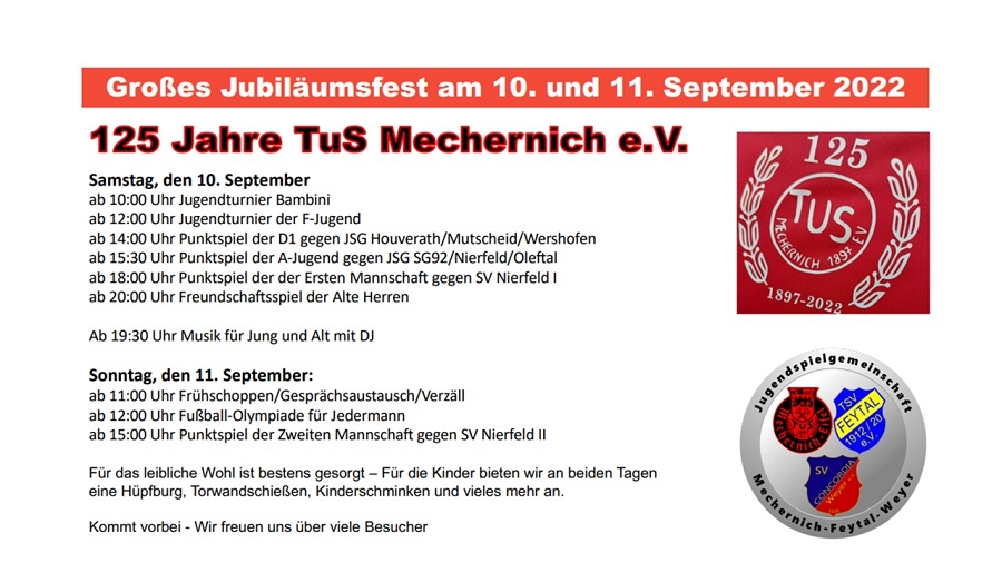 mit Stolz und Freude kann unser Verein TuS Mechernich 1897 e.V. in diesem Jahr auf sein 125-jähriges Bestehen zurückblicken. Für uns ist das ein Grund zu feiern. Nicht pompös und übertrieben, dafür in einem Rahmen, den wir mit eigenen Mitteln und Kräften leisten können.